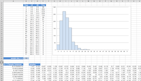 First create a 1000 row by 30 column block of data that follows a standard normal distribution. The NORM.INV() function may be helpful in this regard. We will use this block of data to create random samples of various sizes.